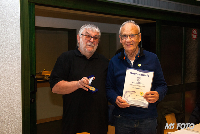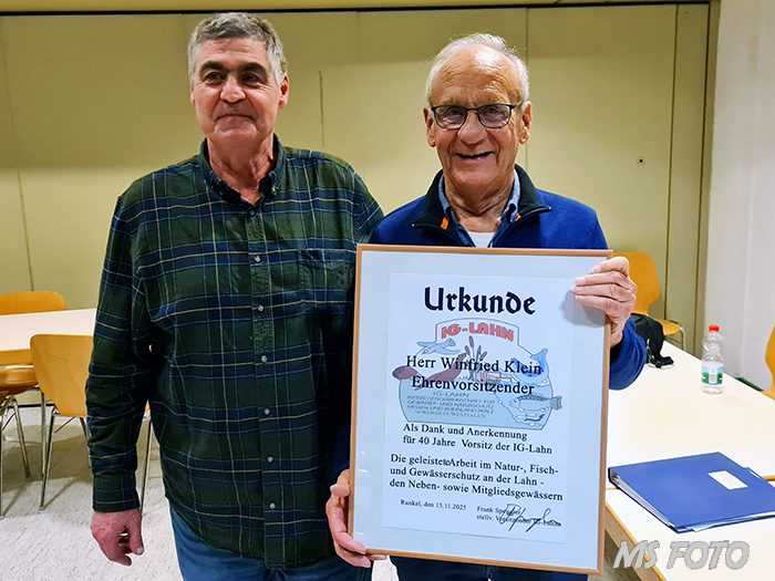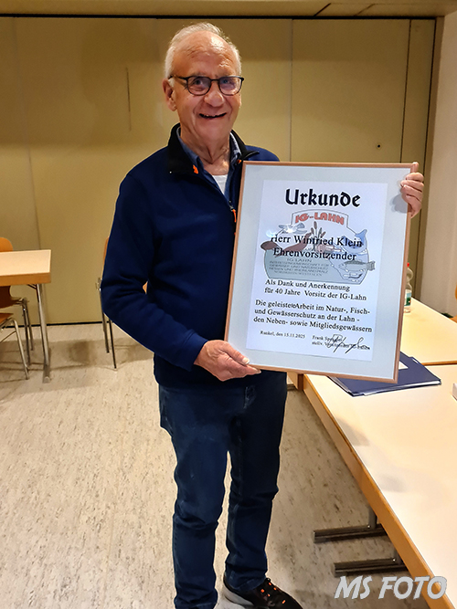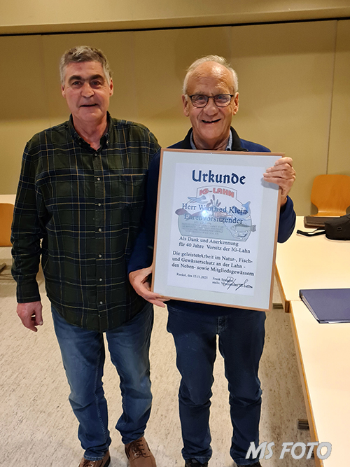 Emotionale Höhepunkte der Versammlung waren die Ehrungen für Winfried Klein, der nach 42 Jahren als Gewässerwart des FSV Oberlahn und 40 Jahren Einsatz für die IG Lahn seiner hohen Verdienste gewürdigt wurde.